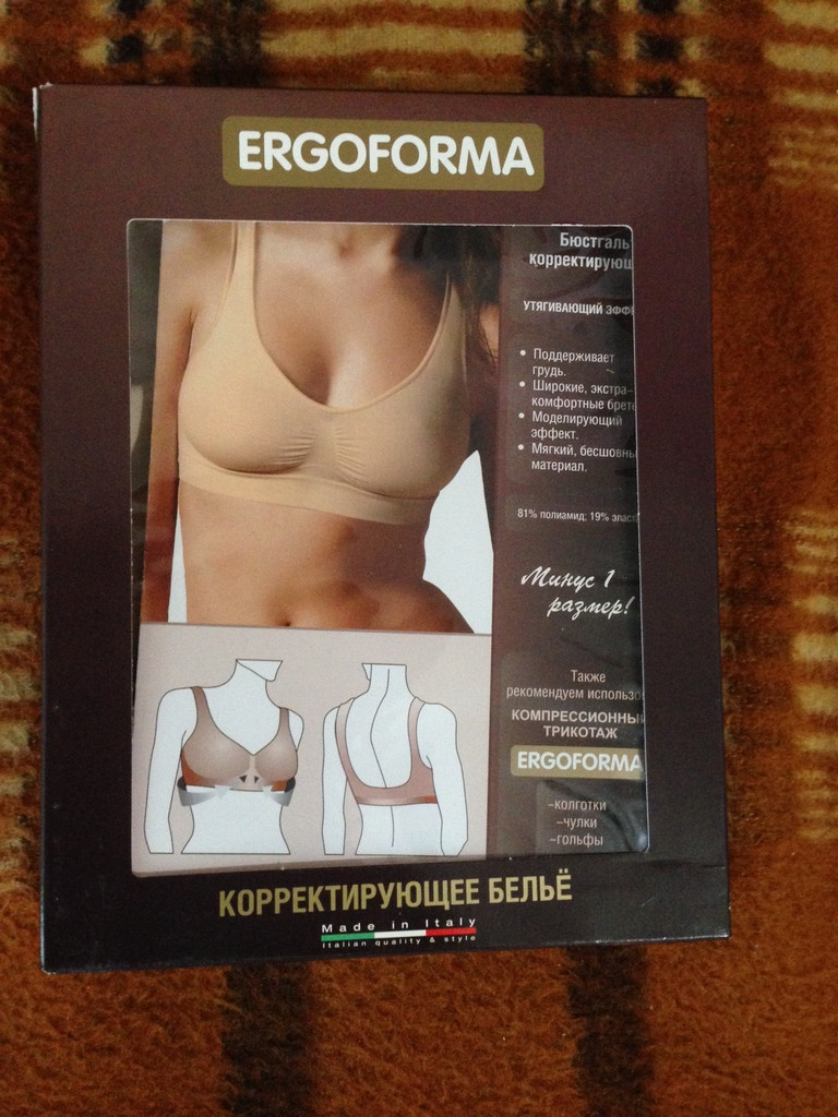 Купила себе спортивный бюстик для занятий на тренировки. Я хоть и не очень крупная, но в зал и на пробежку выхожу регулярно. Утягивающий бюстгальтер в этих ситуациях – идеальный выход, так как не имеет косточек и направляющих, которые давят и могут травмировать. Мне понравилось качество марки Эргоформа – бюст очень хорошо поддерживает грудь. Очень нравится тот факт, что он не сплошной, а разделен выемкой на две чашечки. И очень удобные лямки – широкие и не давят. Сама ткань очень приятная к телу, хорошо подтягивает и поддерживает. Пользуюсь уже месяц, постоянно стираю (правда вручную) – бюстик не растянулся. Спасибо менеджеру, который мне все грамотно рассказал.