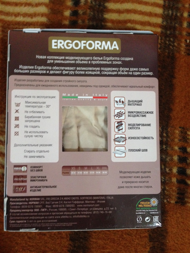 Решила попробовать итальянское утягивающее белье. Доставили быстро, сразу примерила – подошло превосходно, хорошо подобрали размер (менеджер Женя помог, спасибо.). Пока очень довольна. Во всем чувствуется качество. Знаю, о чем говорю, так как был печальный опыт с китайской дешевкой – оно за неделю растянулось и перестало помогать. Здесь же, после месяца повседневной носки белье выглядит как новое.